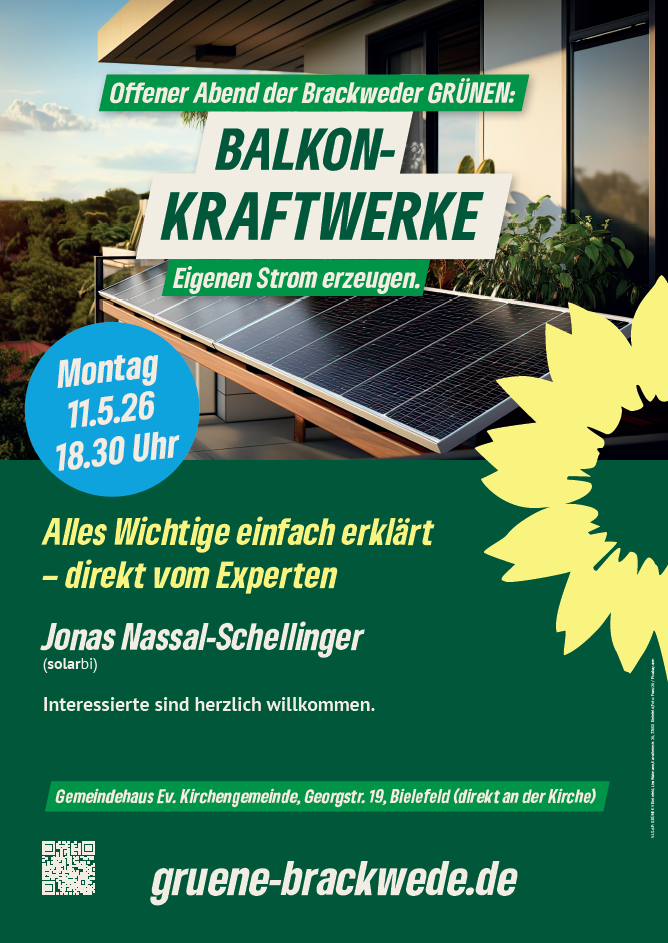 Stromkosten senken mit Balkonkraftwerken  – inzwischen gibt es einen regelrechten Hype um die kleinen Solaranlagen und das nicht zu Unrecht. Aber es gilt einiges zu beachten, wenn man in die umweltfreundliche Technik einsteigen möchte. Zu einem Offenen Abend der Brackweder Grünen mit dem Experten Jonas Nassal-Schellinger am 11. Mai 2026 – 18:30 bis 21 Uhr (im Gemeindehaus Ev. Kirchengemeinde, Georgstr. 19, 33649 Bielefeld) sind alle Interessierten herzlich eingeladen.